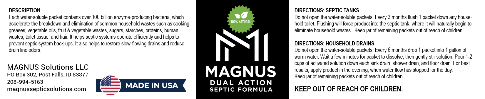 Keep your septic system running smoothly and your drains flowing freely with **Magnus Dual Action Septic Formula** – the 100% natural powerhouse packed with **over 100 billion enzyme-producing bacteria** per water-soluble packet. Say goodbye to clogs, backups, and stubborn odors caused by everyday household waste like cooking greases, vegetable oils, starches, proteins, toilet tissue, hair, and more. This eco-friendly formula accelerates the natural breakdown of organic matter, restores slow drains, and prevents costly septic backups, all while being **proudly made in the USA**.